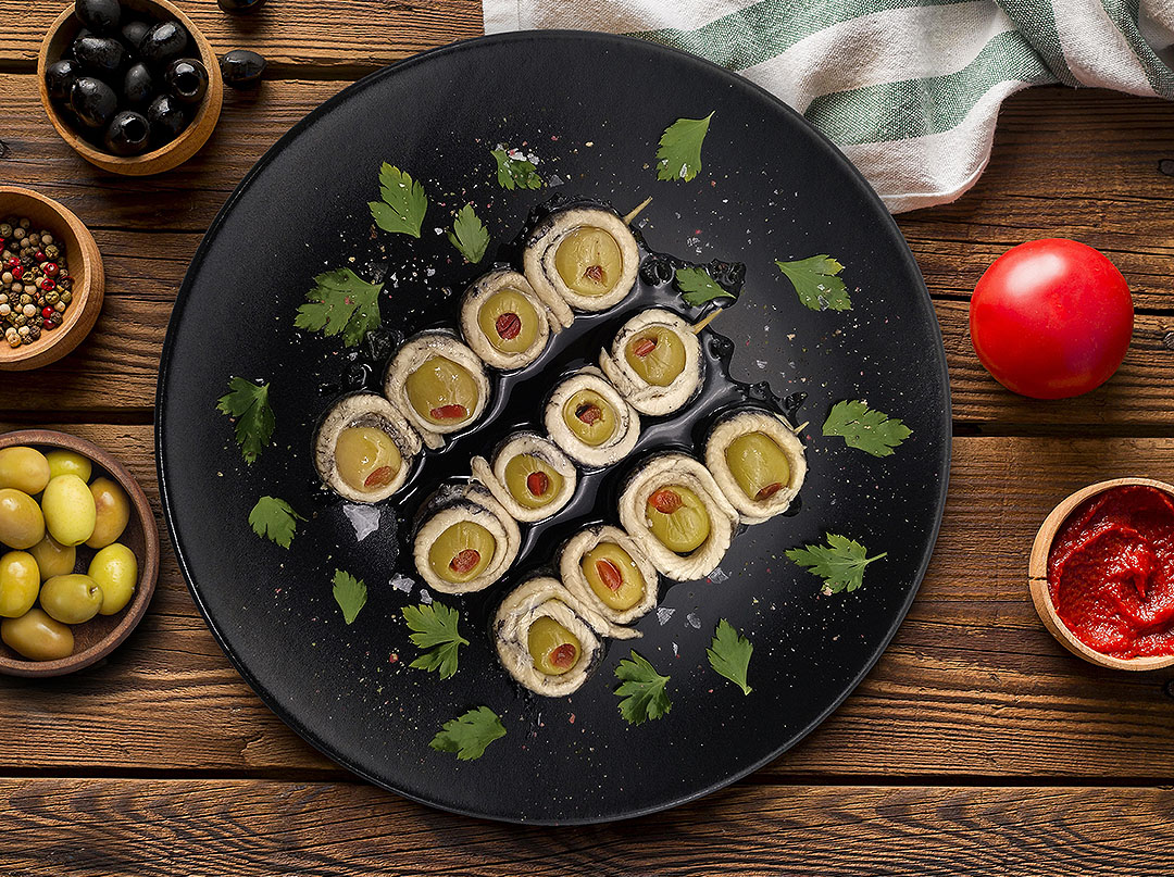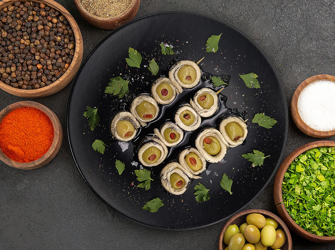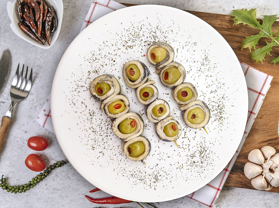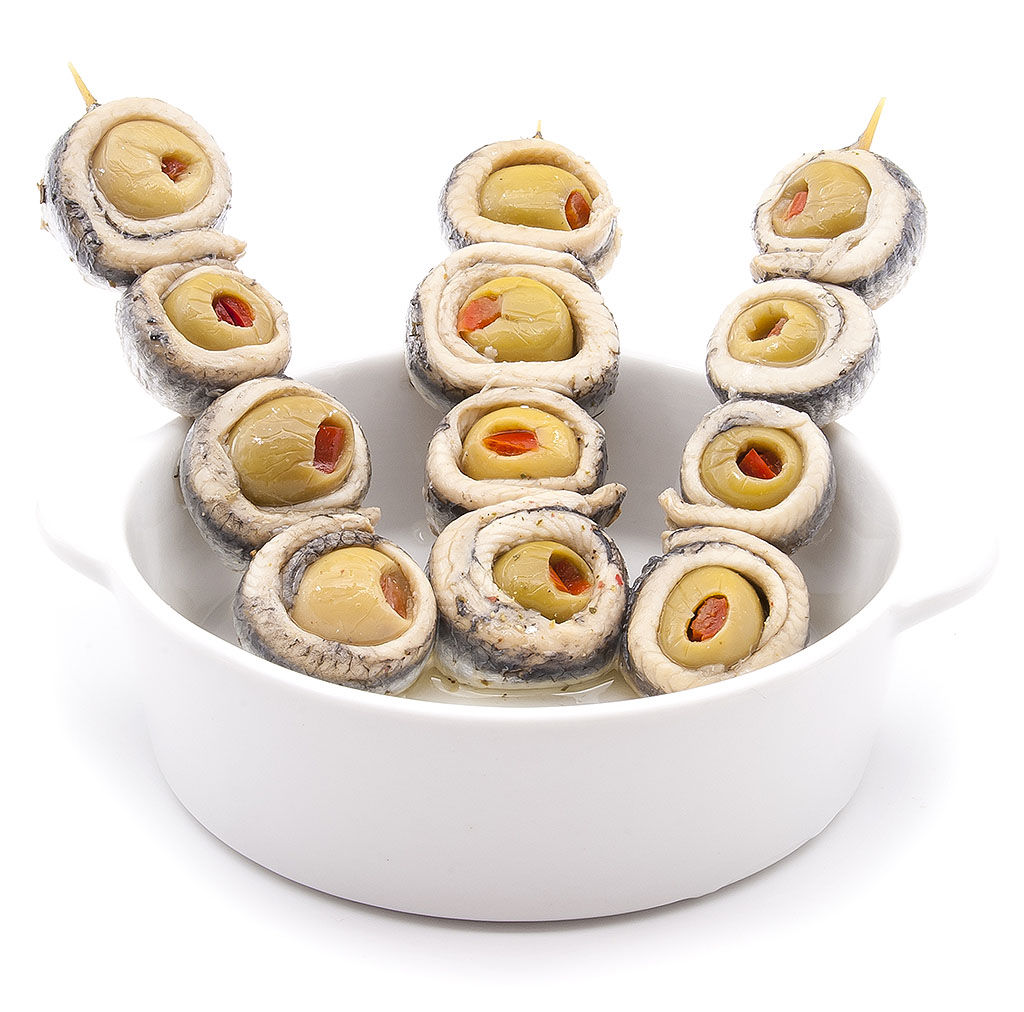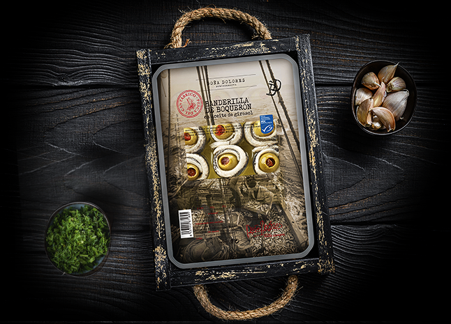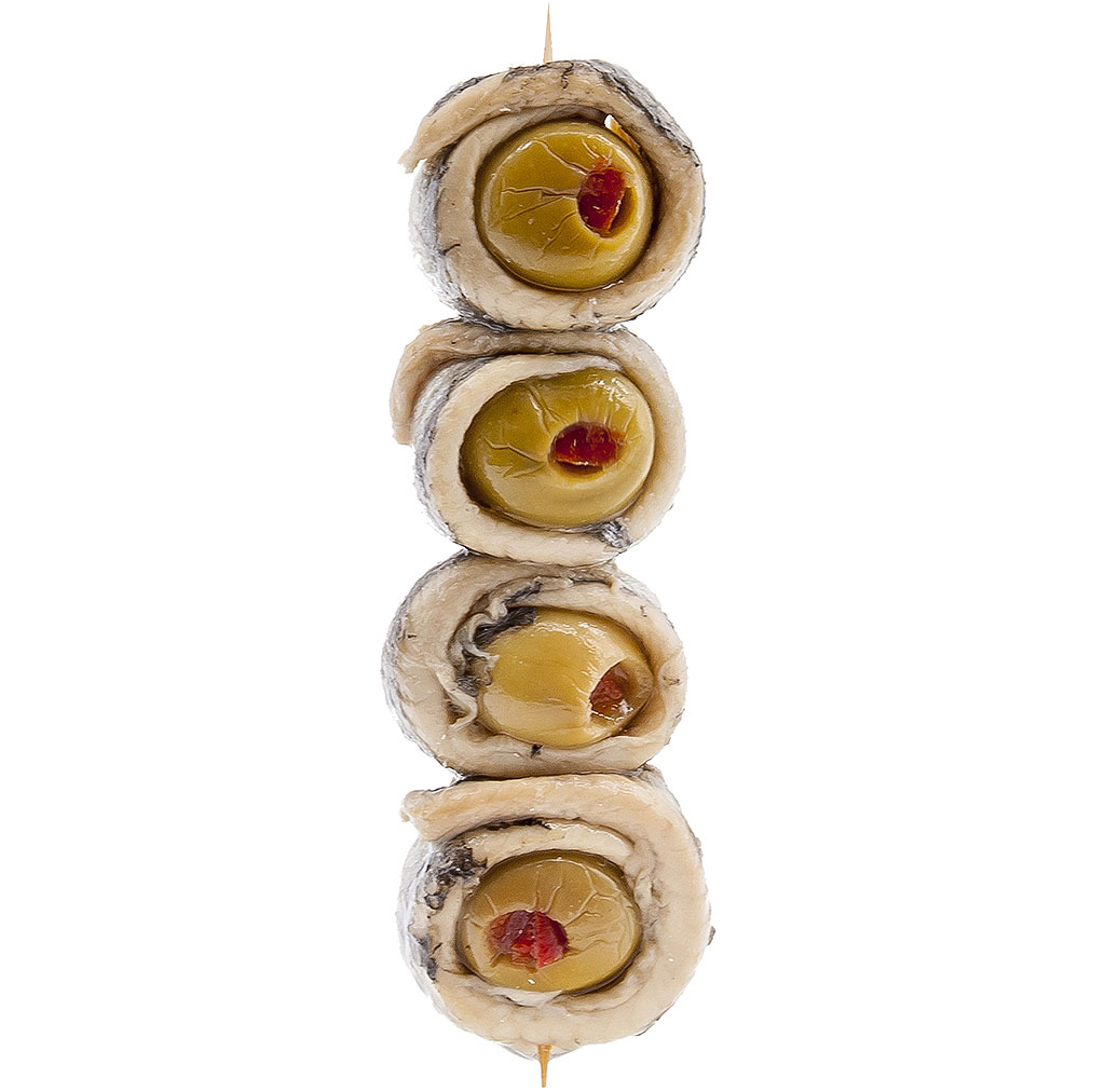 La unión del boquerón con la aceituna rellena es un pincho tradicionalmente conocido como banderilla, que Doña dolores elabora de forma completamente artesanal. El boquerón pasa por una congelación de más de 48 horas para eliminar la posibilidad de anisakis. Un tratamiento en vinagre de más de 24 horas y finalmente se procede a su envasado en aceite de oliva para su consumo directo.